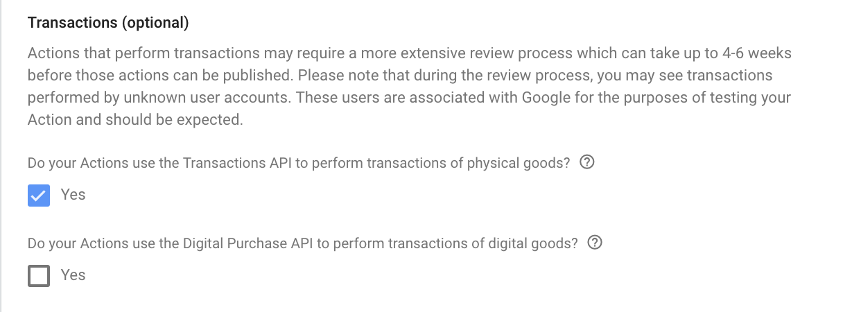 Keep in mind that additional policies apply to Actions that use the transactions and Orders API. It can take us up to six weeks to review Actions with transactions, so factor that time in when planning your release schedule. To ease the review process, make sure you comply with the policies and guidelines for transactions before submitting your Action for review.