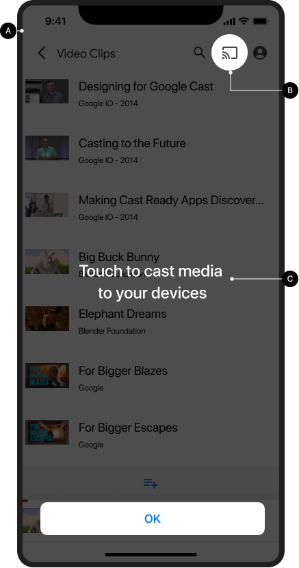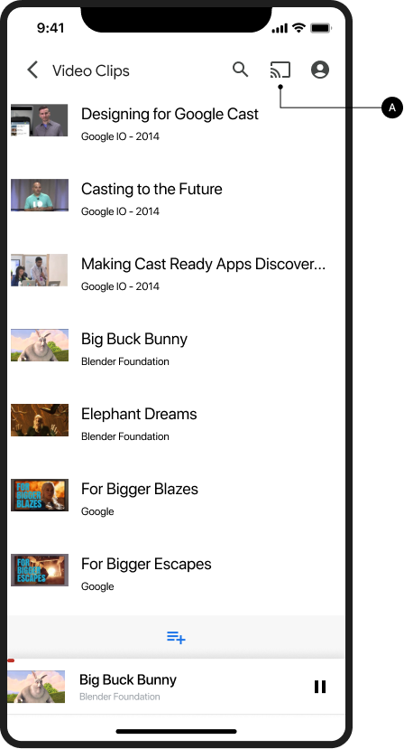 Introducing the Cast button helps existing users know that the sender app now supports Casting and also helps users new to Google Cast.