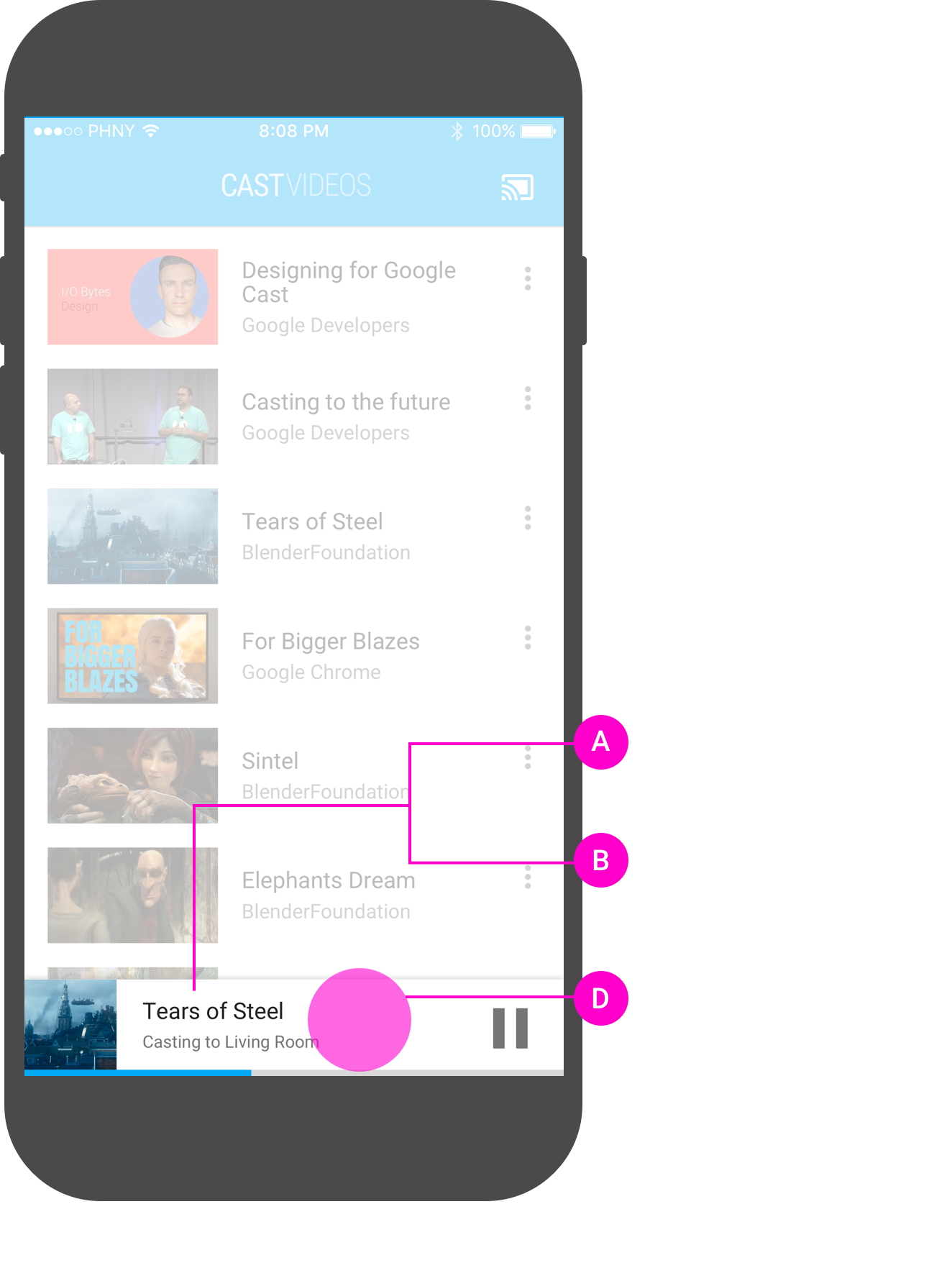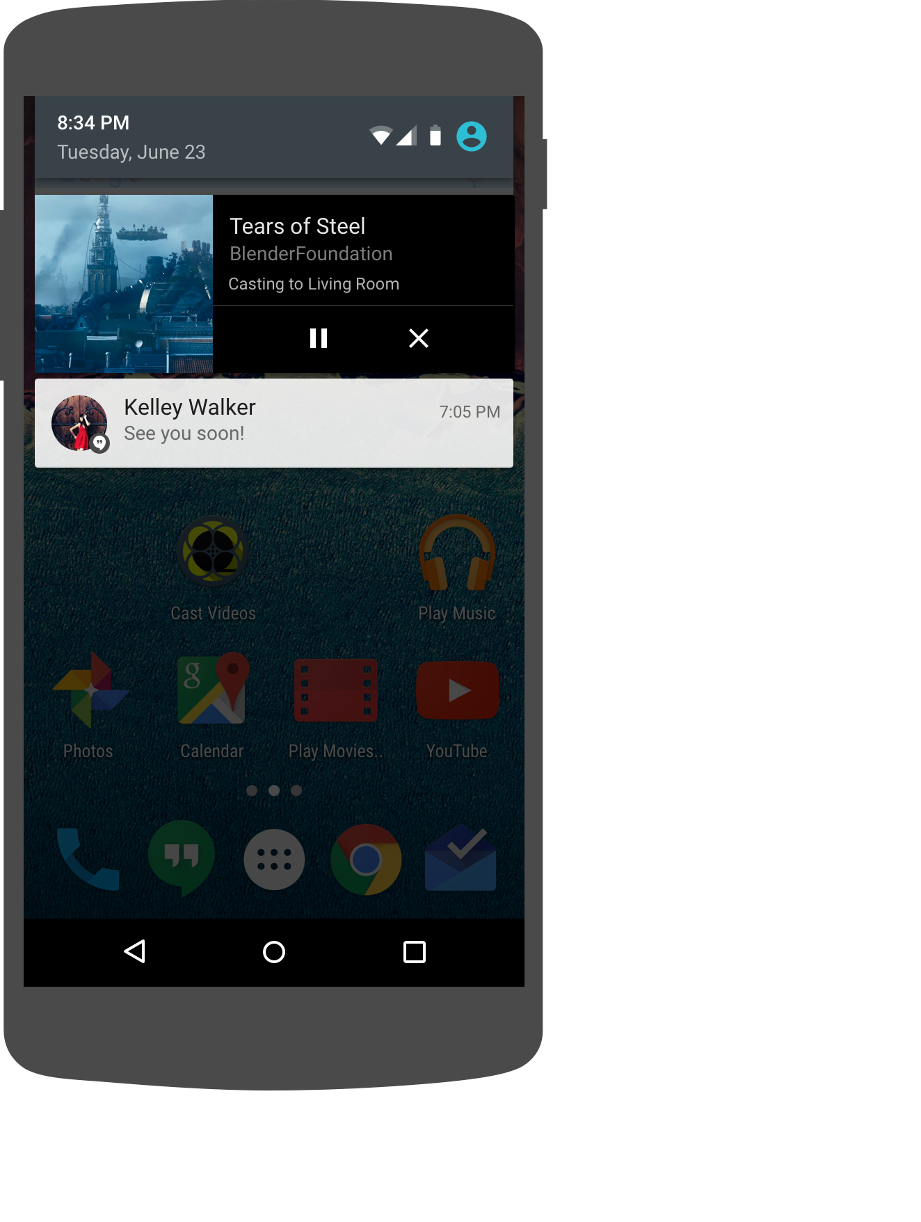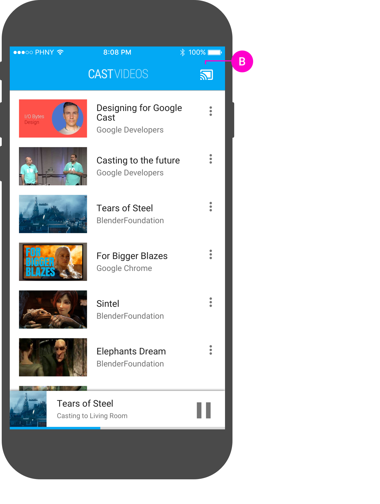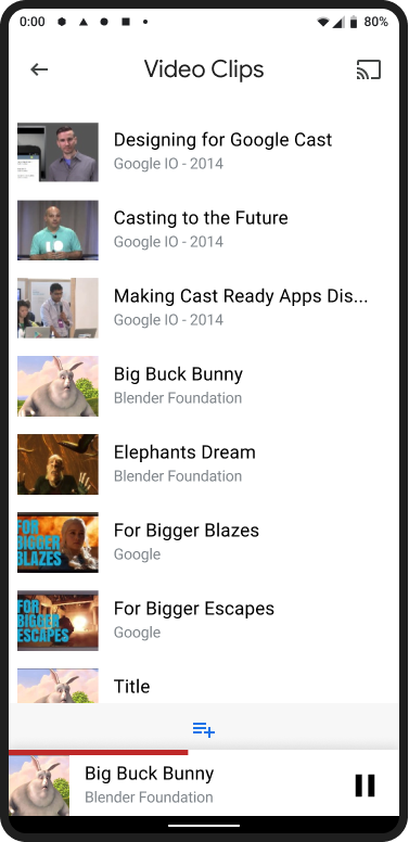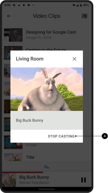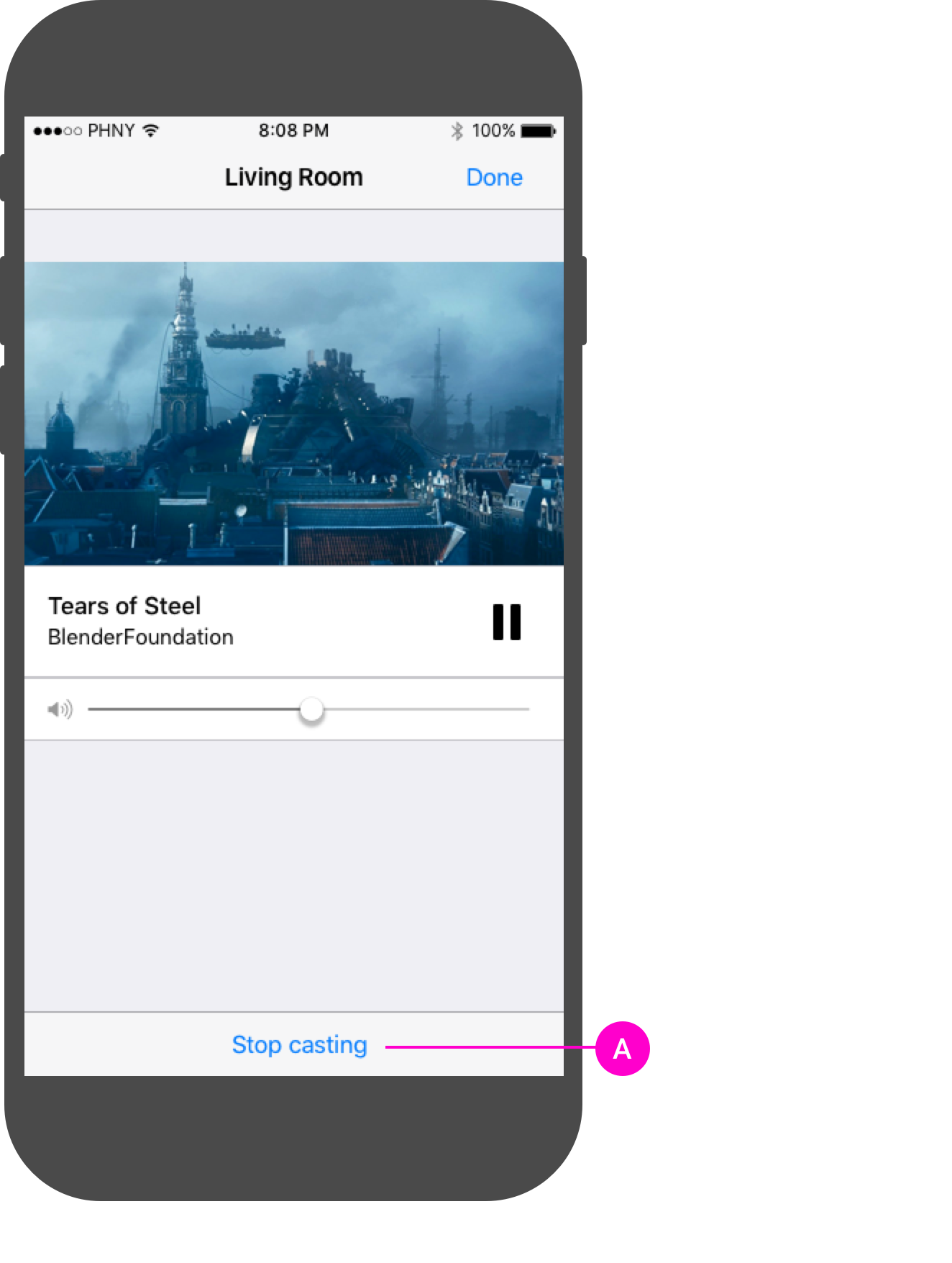 A small, persistent control known as the mini controller should appear, while casting, when the user navigates away from the current content page or expanded controller to another view within the sender app. The mini controller is a visible reminder of the current cast and provides instant access to it.