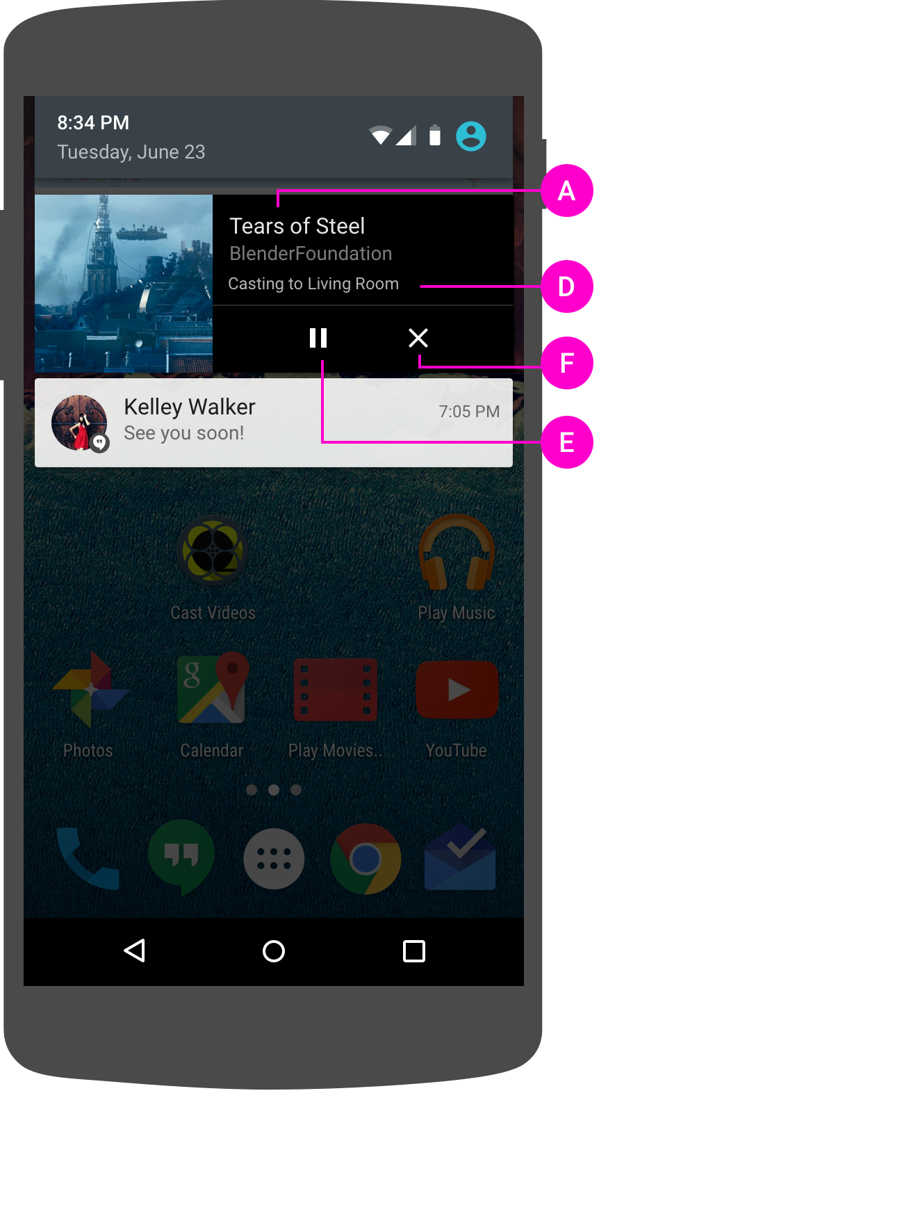MediaSessionorMediaSessionCompat(for versions 4.4 and 4.3) orNotification(for 5.0 and later).