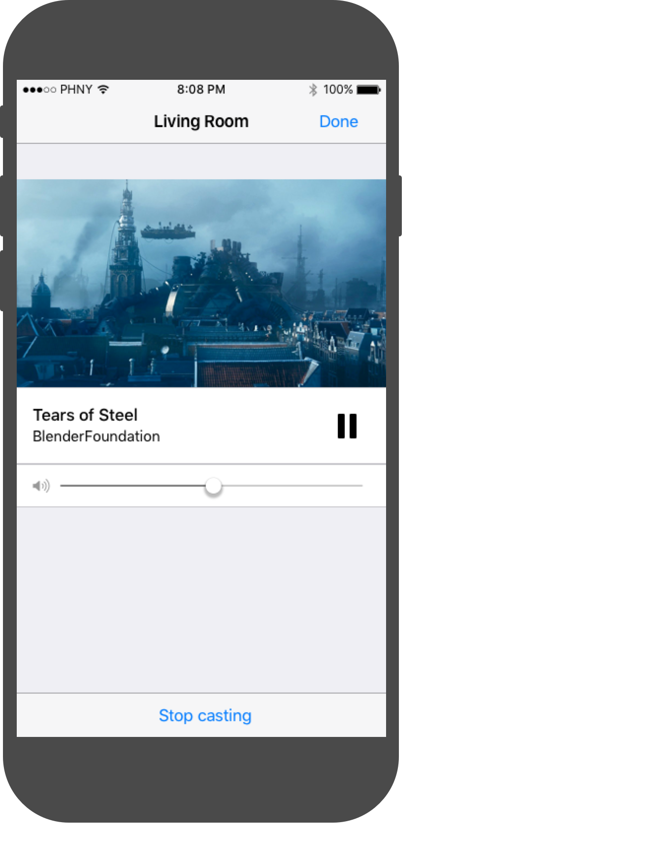 The sender app must allow users to control the volume of the content playing on the TV or speakers, using the hardware volume buttons and/or software volume slider on the sending device. These control either of the following: