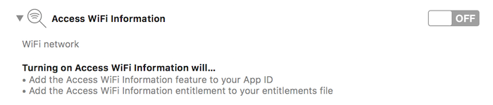 Additionally, your provisioning profile will need to support the Access WiFi Information capability. This can be added in the Apple Developer Portal.