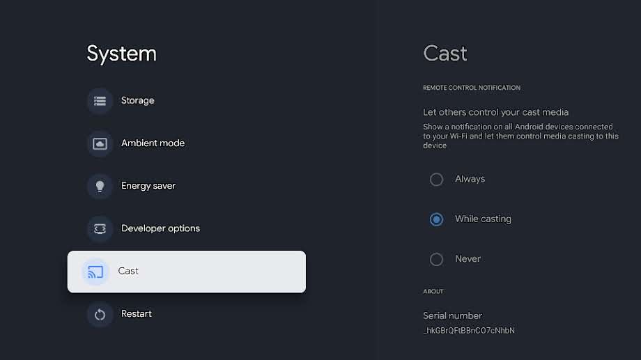 - For audio devices, the serial number is read aloud on the speaker being cast to.