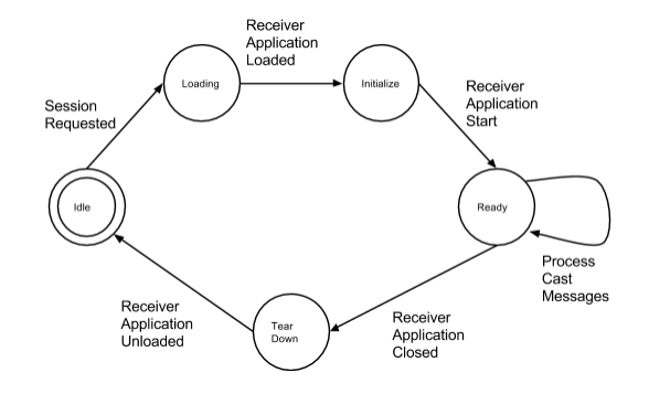The Web Receiver app life cycle starts from the point at which the Web Receiver is loaded onto the Cast device and proceeds to the point at which the application is torn down and the Cast device reverts back to its default state.