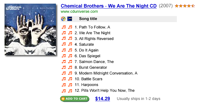 Figure 4: Richly formatted result snippet that provides multimedia access and buttons ("ADD TO CART").