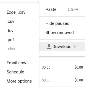 In the UI, reports can be downloaded in various formats, such as CSV, TSV, or XML.