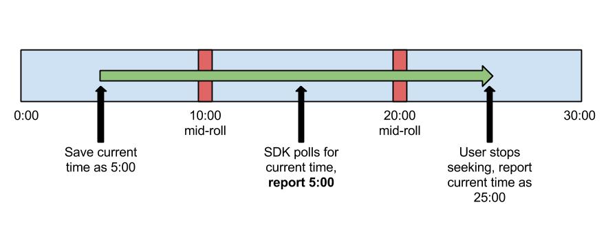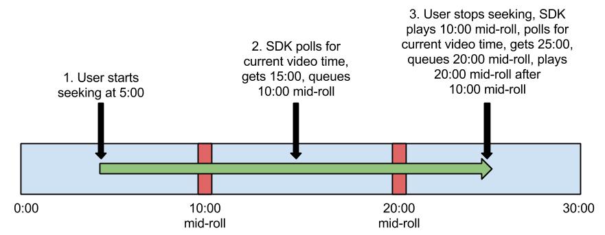If you use ad rules, you may run into a problem with click-and-drag seeking. Specifically, after a user clicks and drags to seek through video past multiple midroll pods, they may see 2 or more of those pods play back to back before content resumes. This is caused by the video playhead time updating while the user is seeking; if the SDK happens to poll for the current time while the user seeks past an ad, it may think that ad should be played. When the content resumes, it plays that ad, and then the most recent ad since the seek. For a visual representation of this problem, see the following diagram: