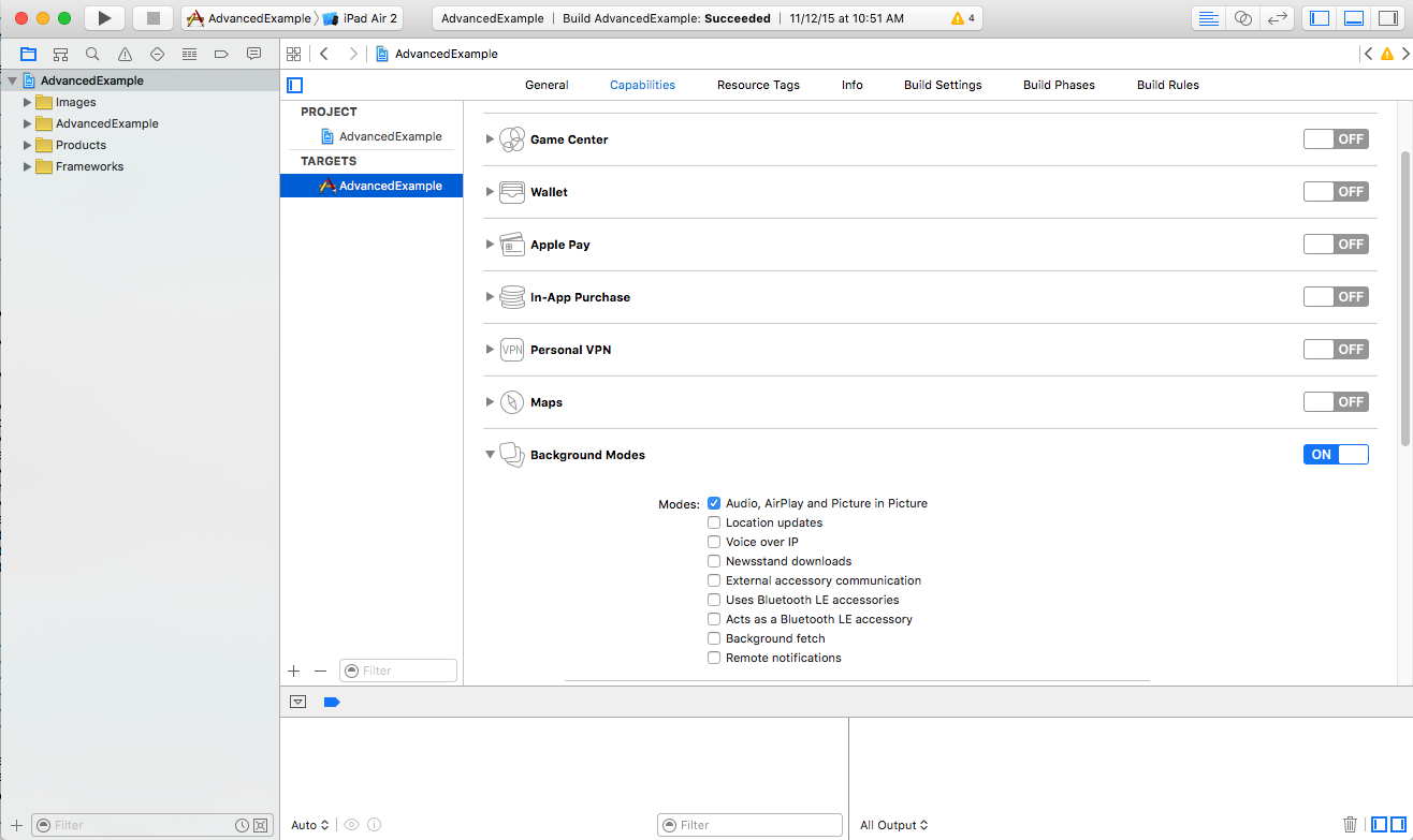 AVAudioSessionproperties to support background playback, as well as enable background playback inIMASettings:... – (void)viewDidLoad { [super viewDidLoad]; self.playButton.layer.zPosition = MAXFLOAT; [[AVAudioSession sharedInstance] setActive:YES error:nil]; [[AVAudioSession sharedInstance] setCategory:AVAudioSessionCategoryPlayback error:nil]; [self setupAdsLoader]; [self setUpContentPlayer]; } – (void)setupAdsLoader { IMASettings *settings = [[IMASettings alloc] init]; settings.enableBackgroundPlayback = YES; self.adsLoader = [[IMAAdsLoader alloc] initWithSettings:settings]; self.adsLoader.delegate = self; }