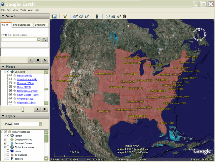 Brian Flood created an interesting KML presentation showing the growth of the United States as states were added to the union. The KML file shown here uses TimeSpan objects with a beginning point only, so that a state (polygon) remains in the display once it is added.
