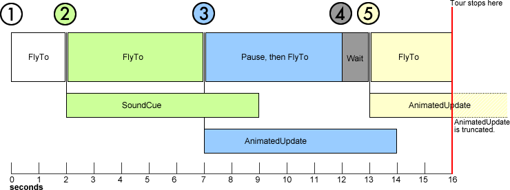• The diagram helps visualize the timing and sequencing of different tour elements, including fly-to animations, sound cues, pauses, and animated updates.