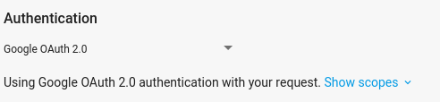 In the APIs Explorer, make sure that Google OAuth 2.0 is selected in the Authentication drop-down menu: