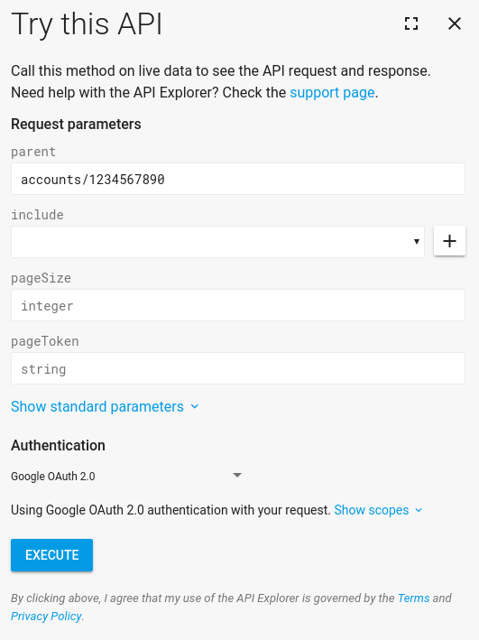 accounts/{account_id}, replacing{account_id}with your Manufacturer ID from your Manufacturer Center account, into the 'parent' field of the form, and click Execute.