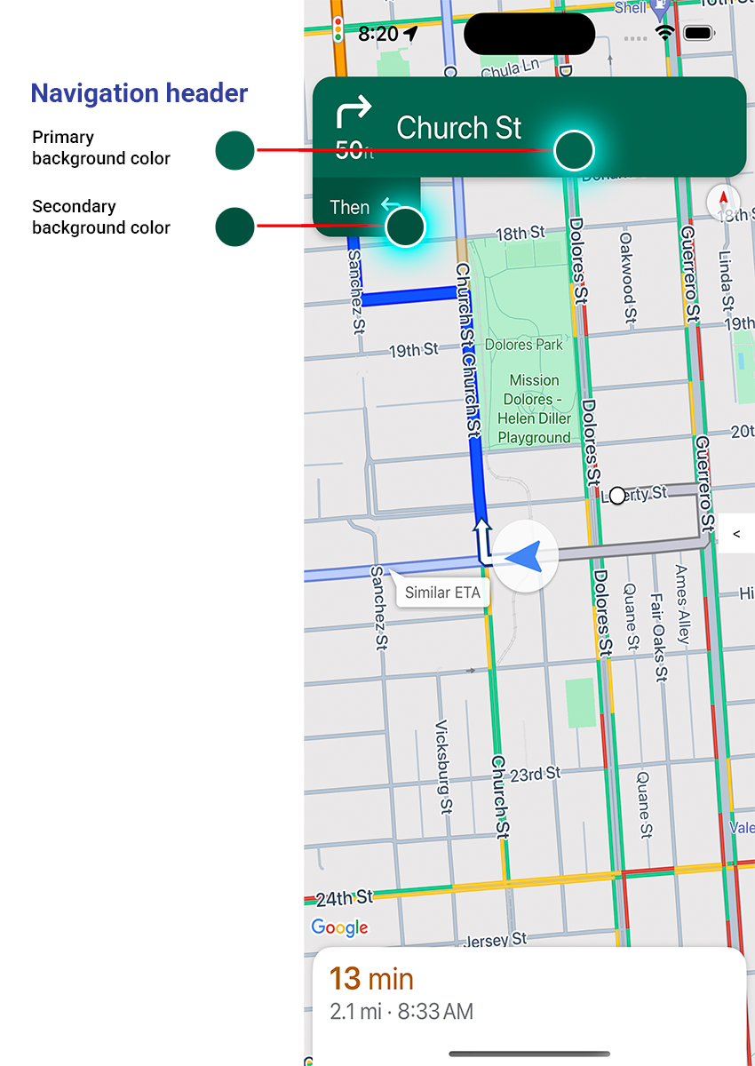The Navigation SDK provides UI accessories that appear during navigation similar to those found in the Google Maps for iOS application. You can adjust the visibility or visual appearance of these controls as described in this section. Changes you make here reflect during the user's next trip.