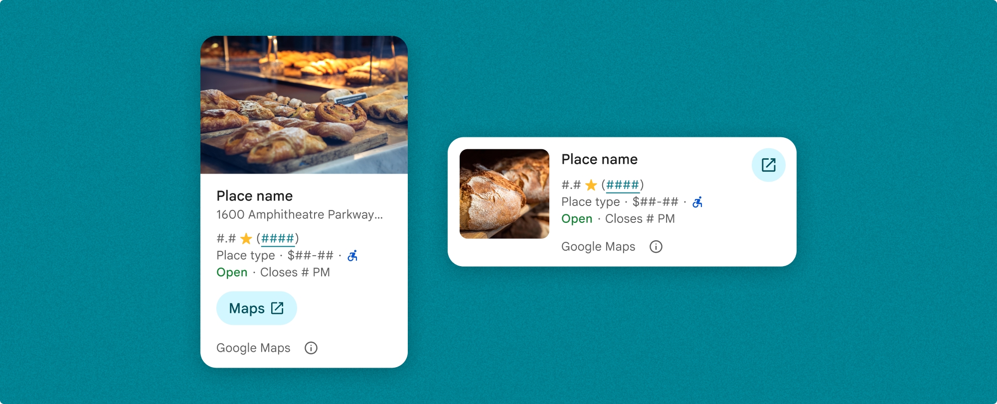 The Place Details compact fragment (PlaceDetailsCompactFragment) renders details for a selected place using minimal space. This may be useful in an info window highlighting a place on a map, in a social media experience like sharing a location in a chat, as a suggestion for selecting your current location, or within a media article to reference the place on Google Maps.