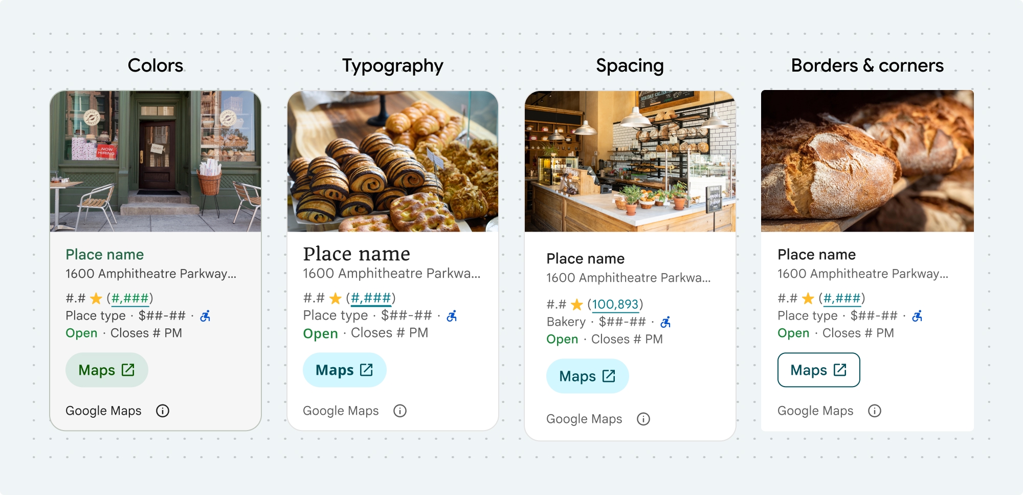 You can customize the colors, typography, spacing, borders, and corners of these Places UI kit components and non-UI kit features: