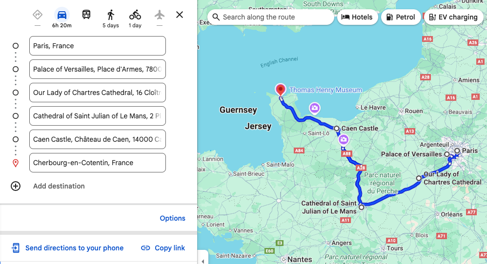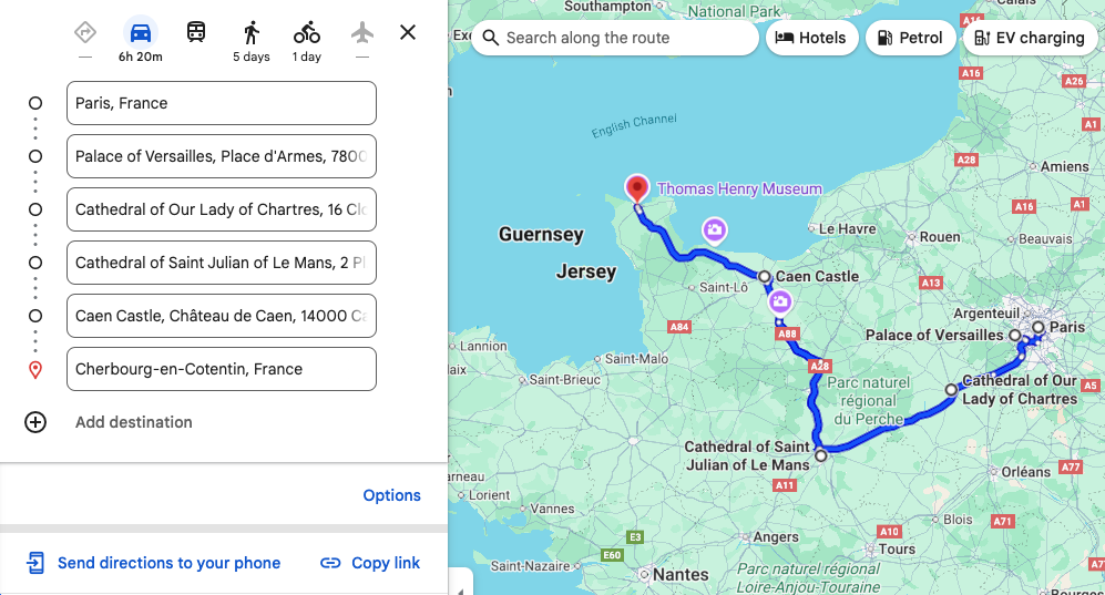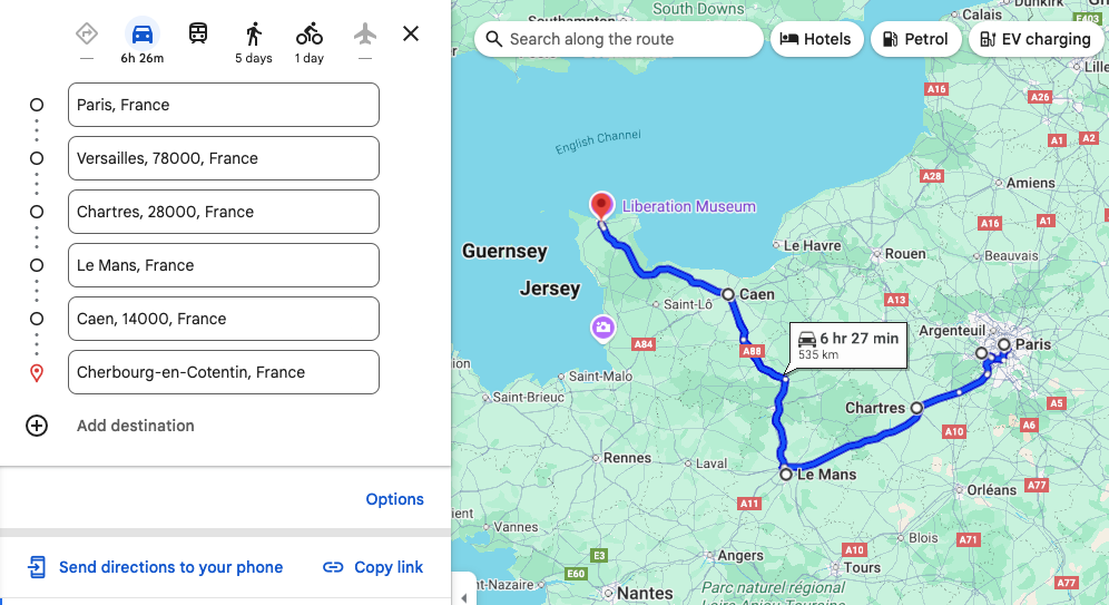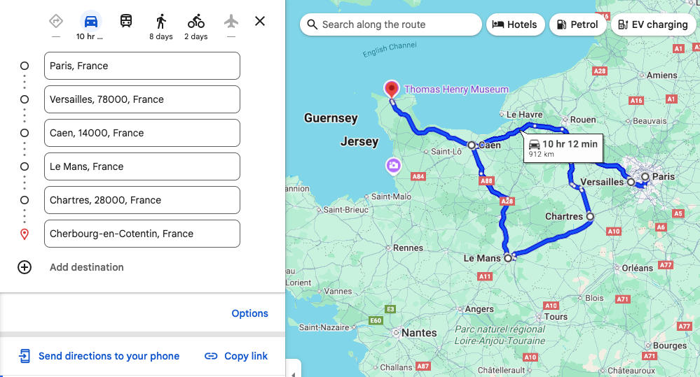 The following directions examples launch Google Maps and display driving directions from Paris, France to Cherbourg, France, routing through the following waypoints: