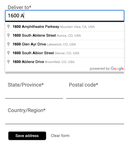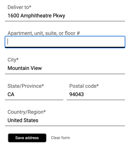 - Leave fields editable in case certain fields are missed from the match and allow customers to update the address if required. Since most addresses returned by Place Autocomplete do not contain subpremise numbers such as apartment, suite, or unit numbers, this example moves the focus to Address Line 2 to encourage the user to fill in that information if necessary.
