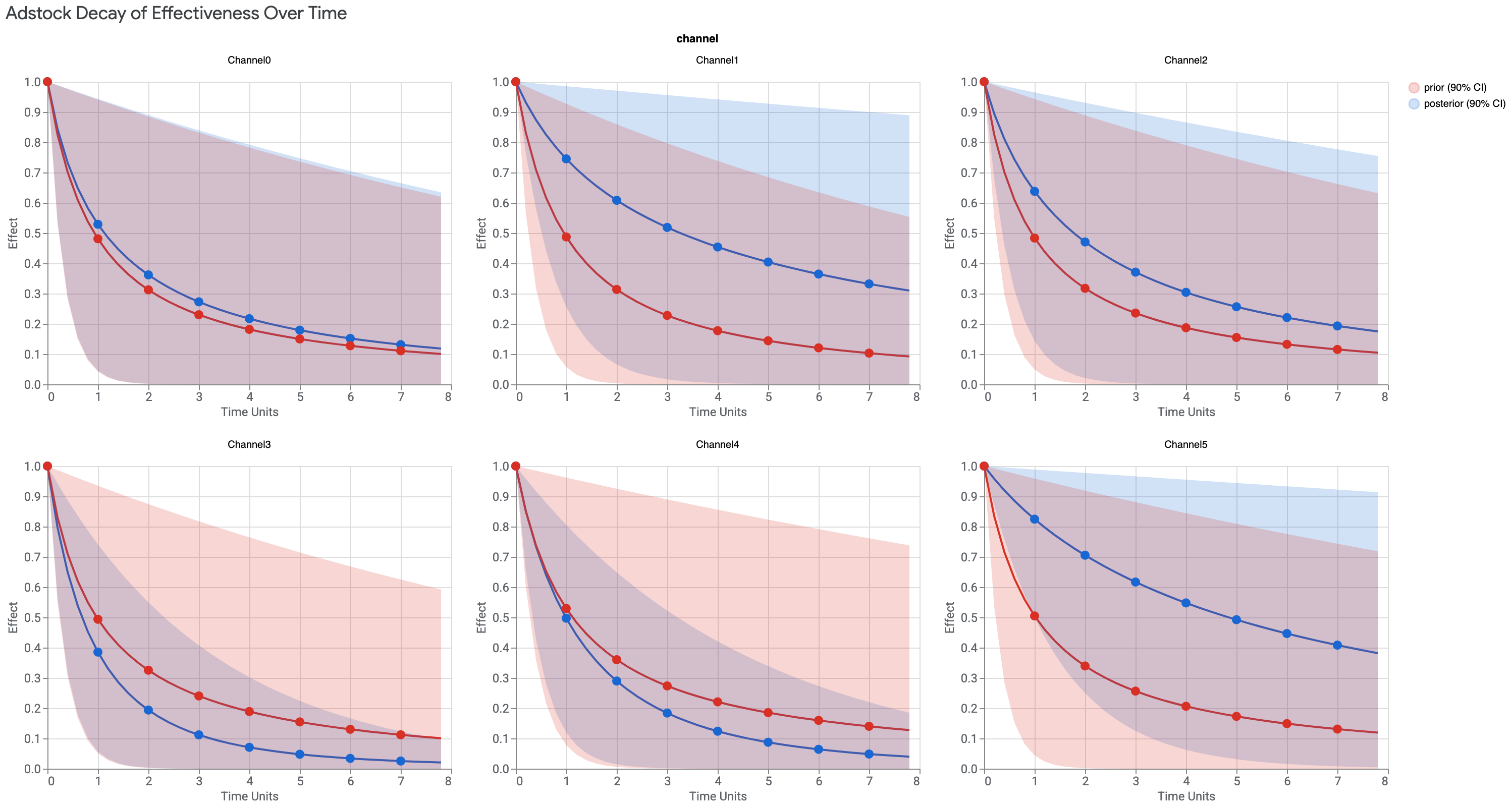 These curves show the decay rate of the media effects, with the monotonic Adstock decay that Meridian uses having the peak effect on the first day. If the posterior is higher than the prior, then the effects of running an ad on that media channel last longer than was assumed.