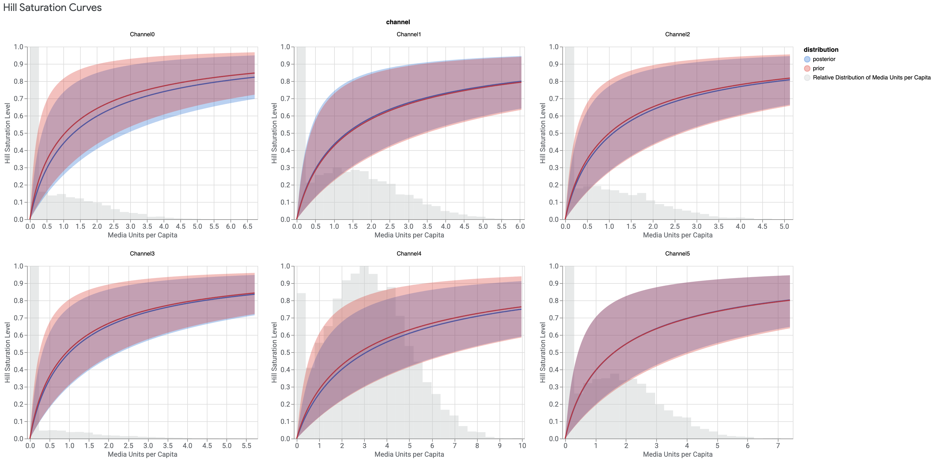 These curves asymptote to 1 as the media units (often impressions) per capita goes to infinity, and show the effect of media units per capita relative to this asymptote. A Hill curve is used to show the saturation (reduced effectiveness).