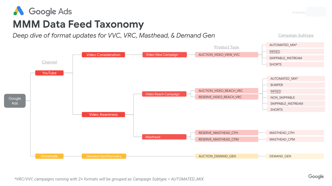 The following image shows the in-depth data formats for Google Ads VVC, VRC, Masthead, and Demand Gen. (Click the image to enlarge.)