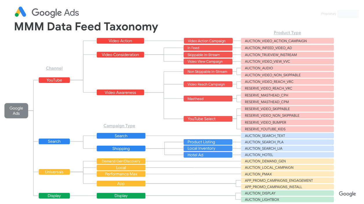 The following image shows a high-level data feed taxonomy for Google Ads. (Click the image to enlarge.)