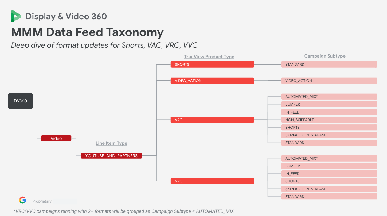 The following image shows the in-depth data formats for Display & Video 360 Shorts, VAC, VRC, and VVC. (Click the image to enlarge.)