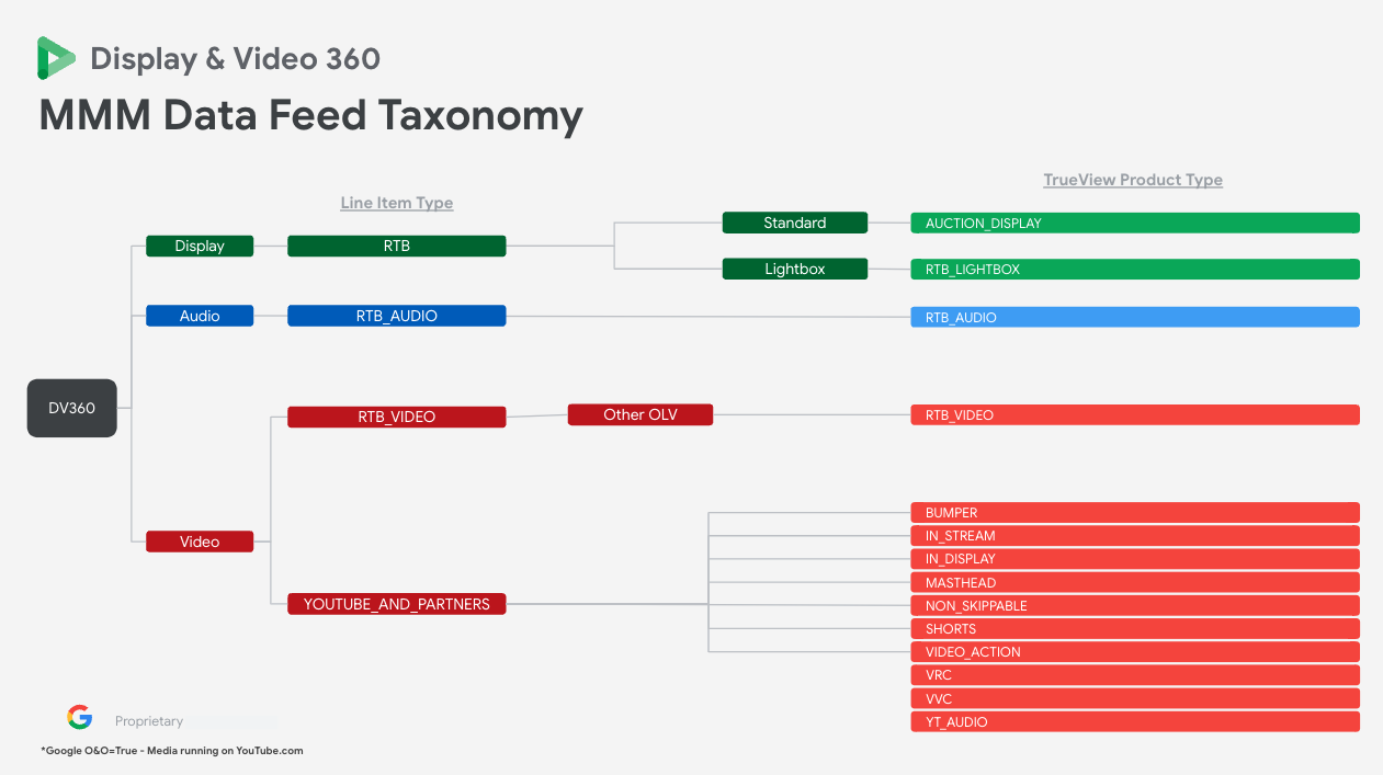 The following image shows a high-level data feed taxonomy for Display & Video 360. (Click the image to enlarge.)