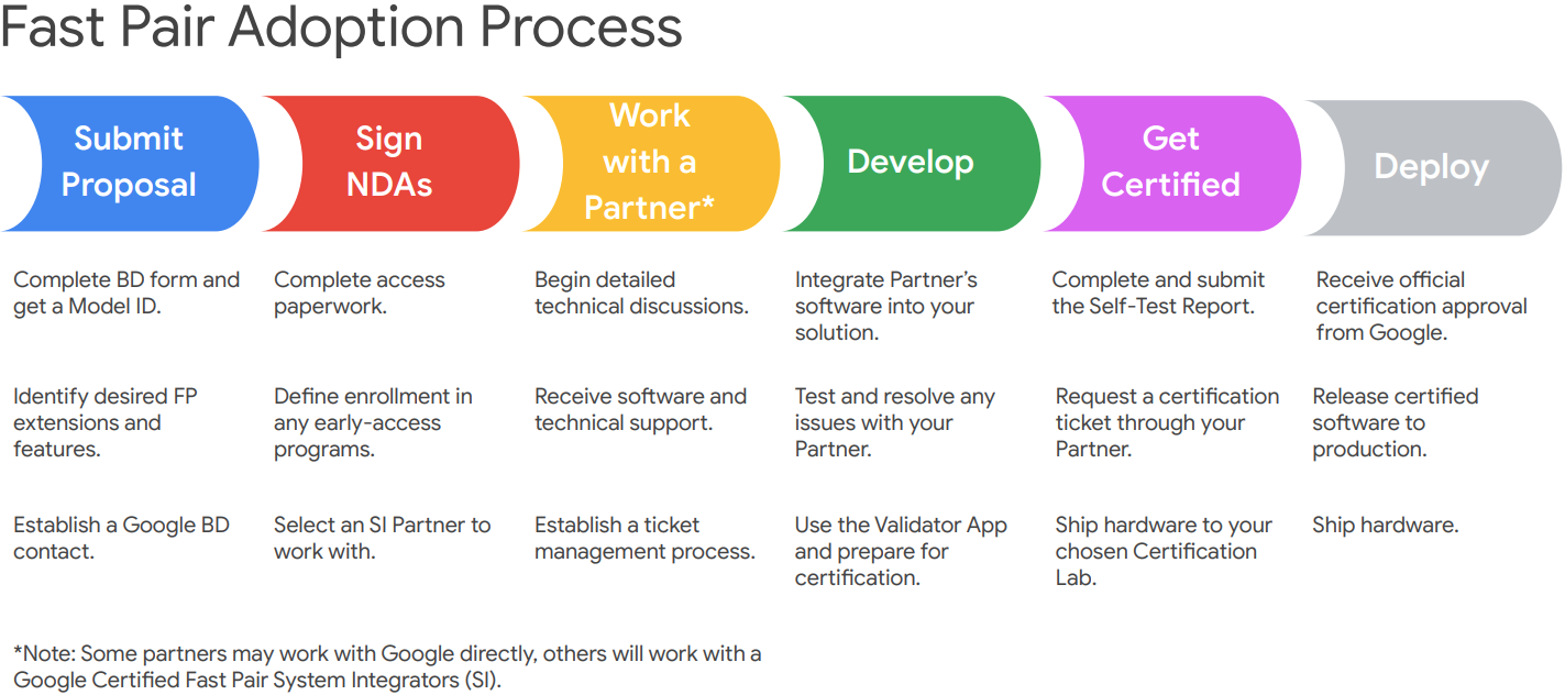 Google works with Google Certified Fast Pair System Integrators (SIs) to provide Partners with prebuilt solutions to common chipsets. Partners seeking ready-made solutions should work closely with their SI partner throughout the FP adoption process.
