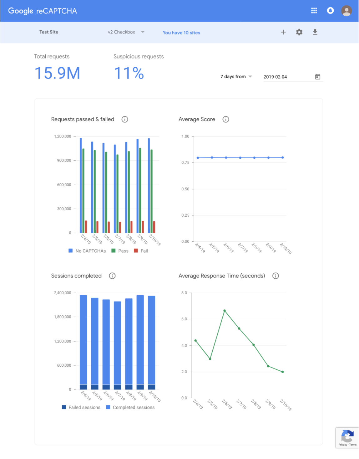 There are 4 charts available for the reCAPTCHA v2 site type. Some of the charts might not be shown before there is sufficient traffic to your site.