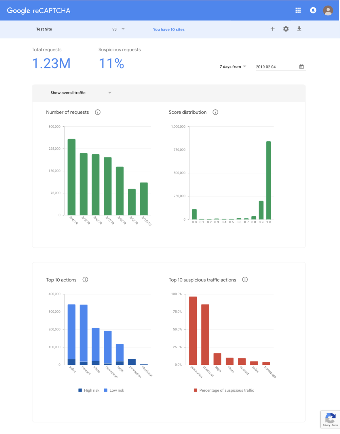 | Top 10 Actions | This chart shows the top 10 actions (by overall traffic) for your site. To improve the adaptive risk analysis for your site and to view a more detailed breakdown of your traffic, specify an action name in each place that you execute reCAPTCHA verification. |