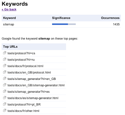 keyword, and displaying a handful of URLs that contain a specific keyword. The significance
