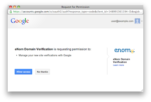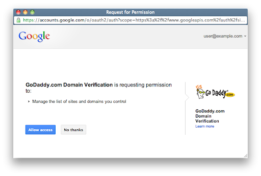 The first time you log in, you'll be asked to authorize the provider to access the Google site verification service on your behalf.
