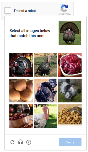 This new API also lets us experiment with new types of challenges that are easier for us humans to use, particularly on mobile devices. In the example below, you can see a CAPTCHA based on a classic Computer Vision problem of image labeling. In this version of the CAPTCHA challenge, you're asked to select all of the images that correspond with the clue. It's much easier to tap photos of cats or turkeys than to tediously type a line of distorted text on your phone.