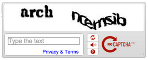 reCAPTCHA protects the websites you love from spam and abuse. So, when you go online—say, for some last-minute holiday shopping—you won't be competing with robots and abusive scripts to access sites. For years, we've prompted users to confirm they aren't robots by asking them to read distorted text and type it into a box, like this: