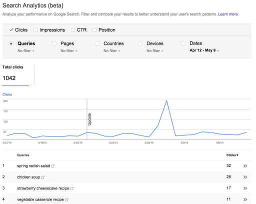 The new Search Analytics report provides detailed information on top queries, top app pages, and traffic by country. It also has a comprehensive set of filters, allowing you to narrow down to a specific query type or region, or sort by clicks, impressions, CTR, and positions.