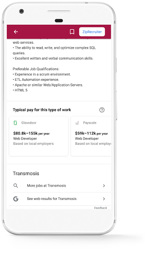 In cases where employers don't provide actual salary, job seekers may see estimated salaries sourced from multiple partners for the same or similar occupation. If your site provides salary estimate information, you can add Occupation structured data to be eligible for inclusion in job search results.