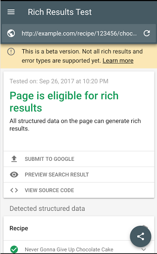 The new testing tool focuses on the structured data types that are eligible to be shown as rich results. It allows you to test all data sources on your pages, such as JSON-LD (which we recommend), Microdata, or RDFa. The new tool provides a more accurate reflection of the page's appearance on Search and includes improved handling for Structured Data found on dynamically loaded content. The tests for Recipes, Jobs, Movies, and Courses are currently supported — but this is just a first step, we plan on expanding over time.