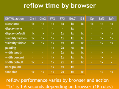 From the table above it's clear that not all changes to the style in JavaScript cause a reflow in all browsers, and that the time it takes to reflow varies. It is also somewhat clear that modern browsers are getting better at reflow times.