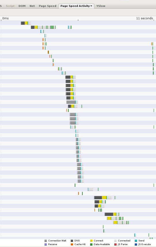 As web pages become more complex, referencing resources from numerous domains, DNS lookups can become a significant bottleneck in the browsing experience. Whenever a client needs to query a DNS resolver over the network, the latency introduced can be significant, depending on the proximity and number of name servers the resolver has to query (more than 2 is rare, but it can happen). As an example, the following screen shot shows the timings reported by the Page Speed web performance measurement tool. Each bar represents a resource referenced from the page; the black segments indicate DNS lookups. In this page, 13 lookups are made in the first 11 seconds in which the page is loaded. Although several of the lookups are done in parallel, the screen shot shows that 5 serial lookup times are required, accounting for several seconds of the total 11 seconds page load time.