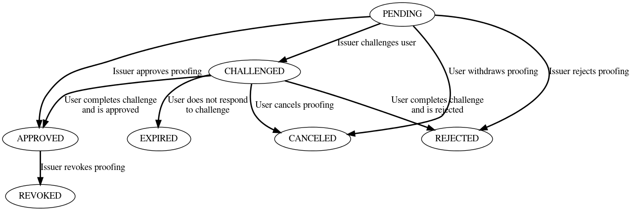 Proofing involves users submitting identity evidence, like photos and videos, which Issuers review to decide on identity verification, and a proofing status can be Pending, Accepted, Rejected, Challenged, Canceled, Revoked, or Expired.
