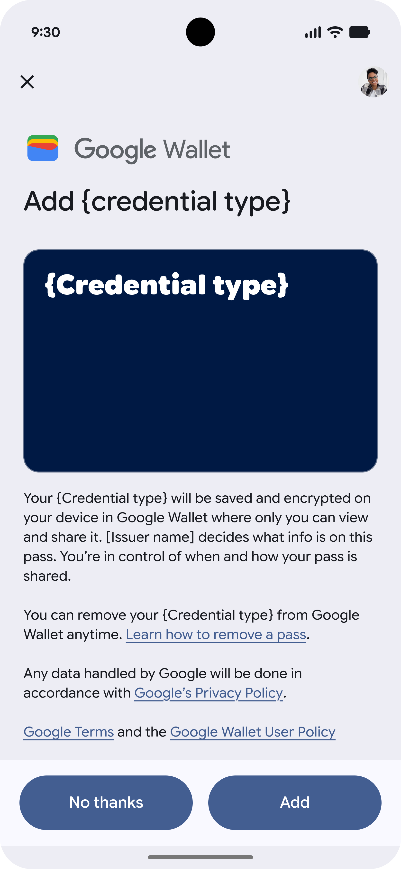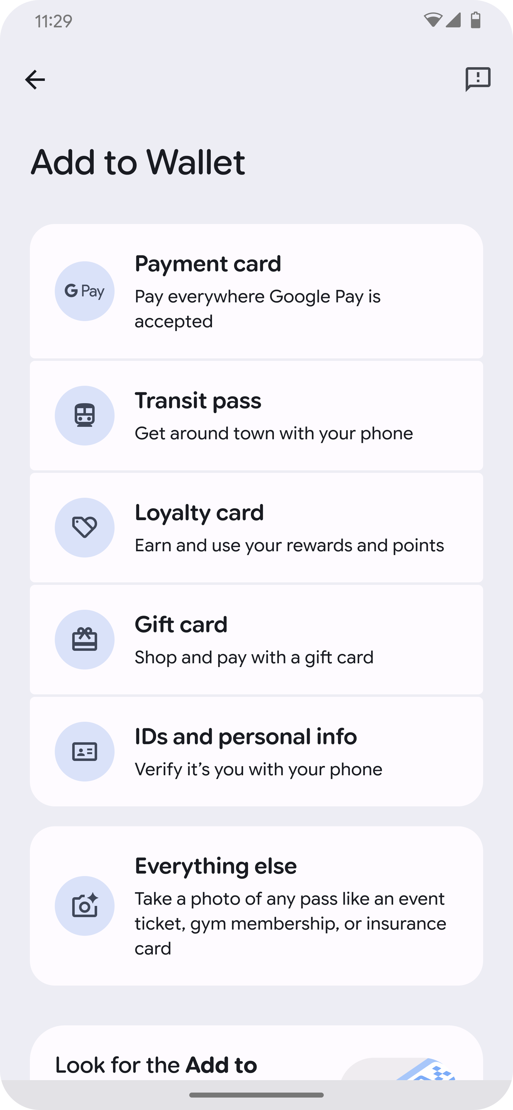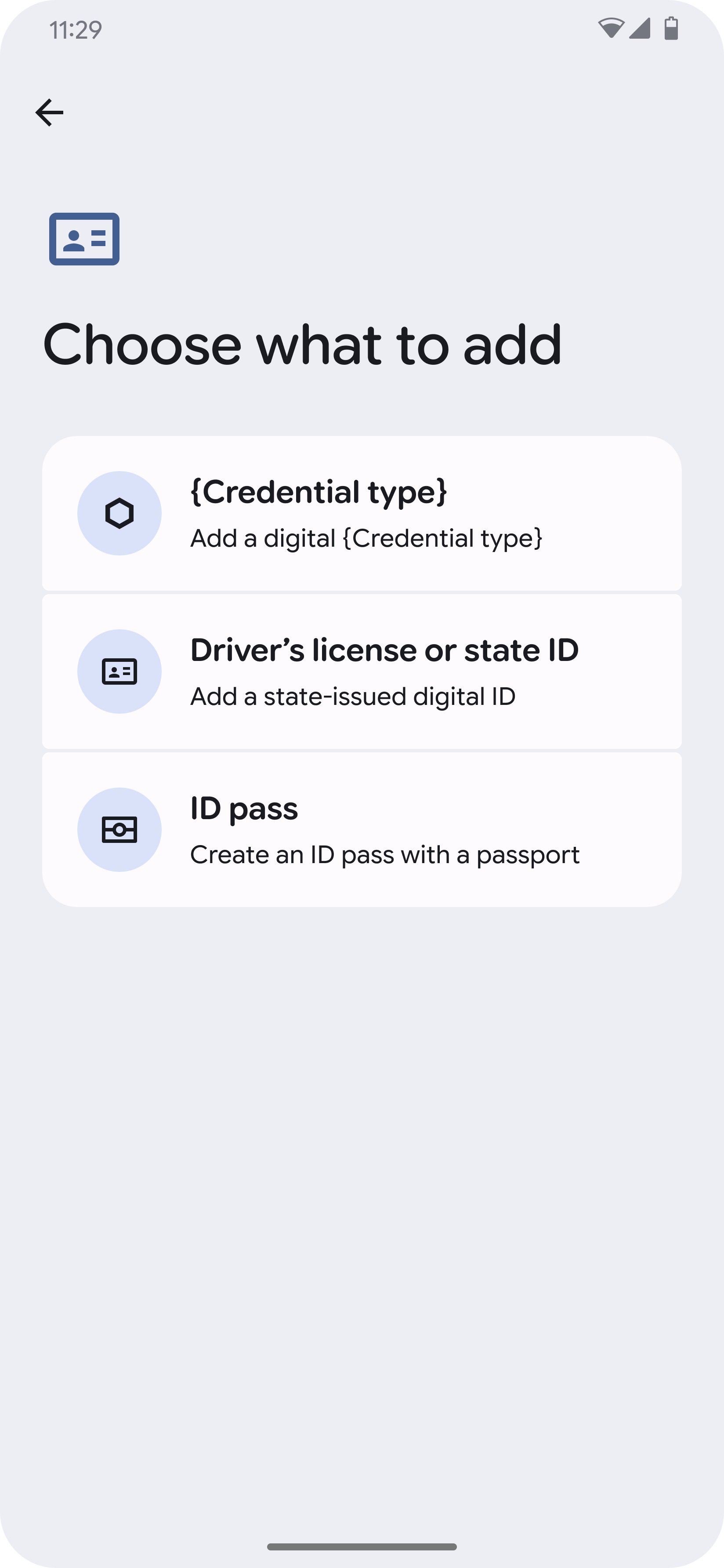 The Add to Wallet screen in the Google Wallet app. A list of issuers for the user's ID. A list of issuers for the user's ID.