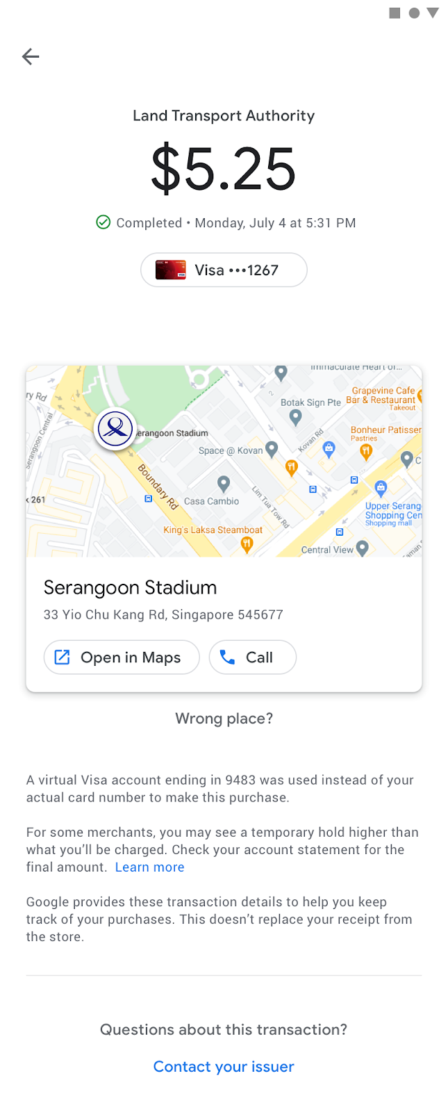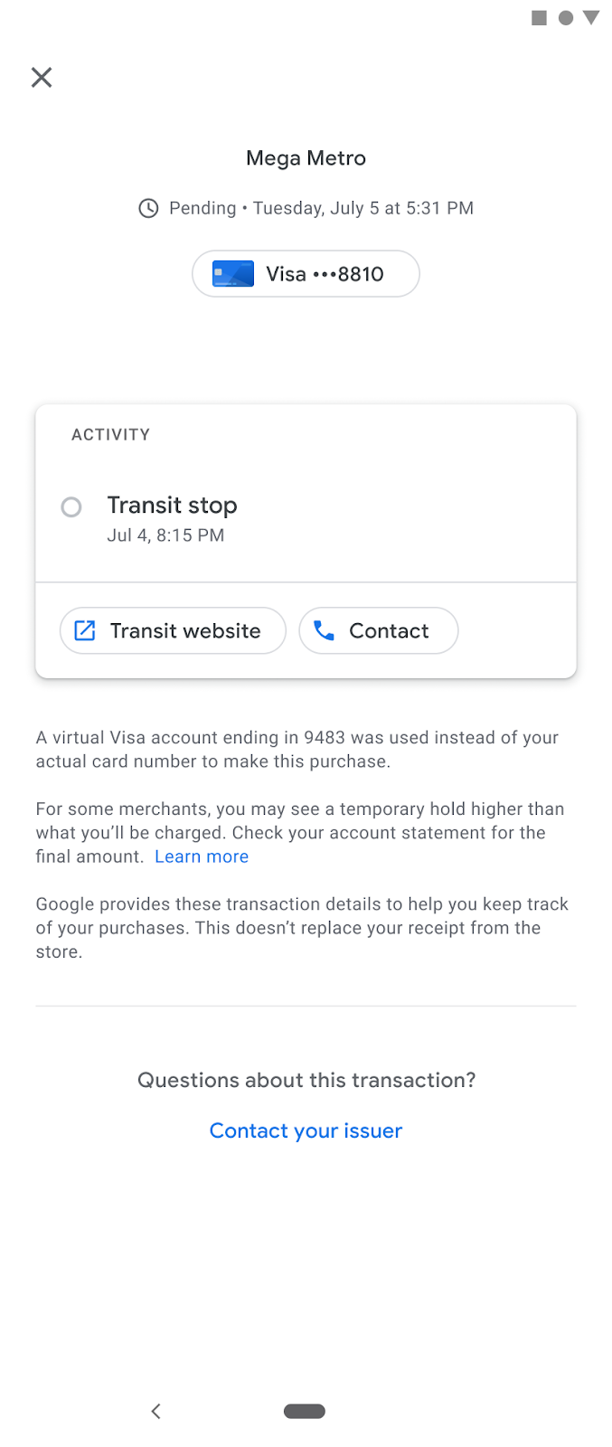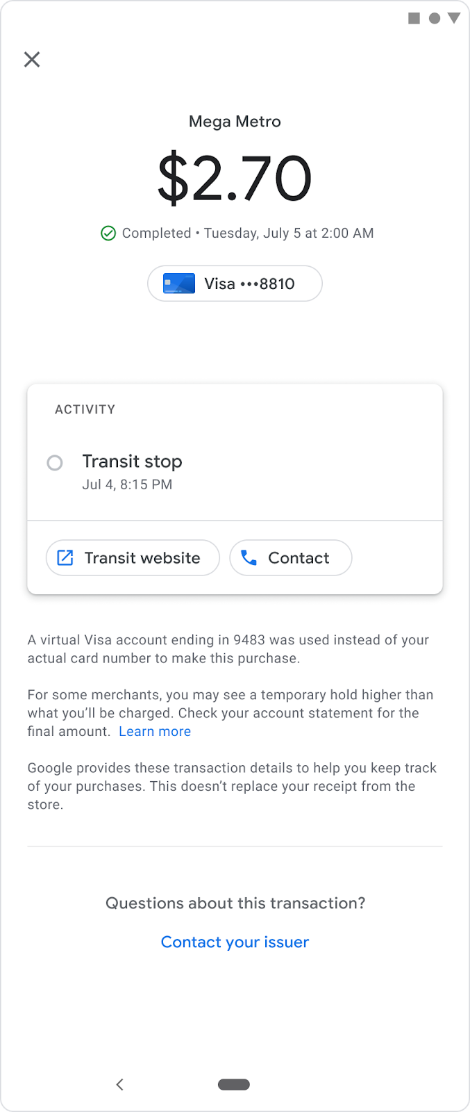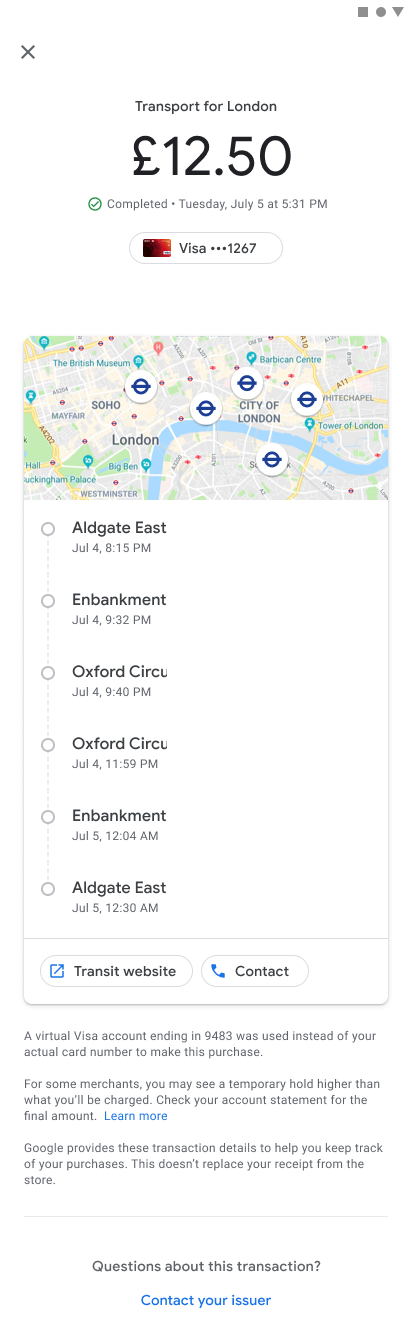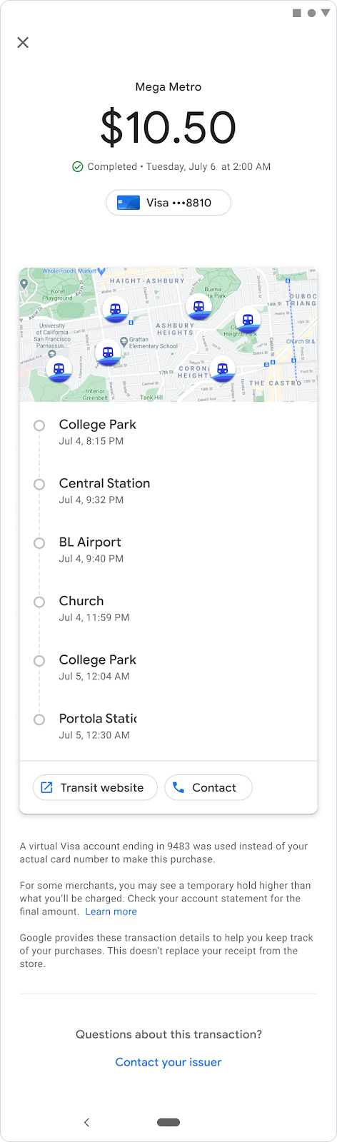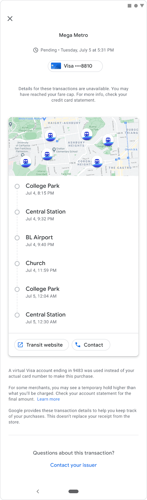 Google Wallet provides detailed transaction history with rich receipts including agency details, location maps, and fare capping summaries for transit users.