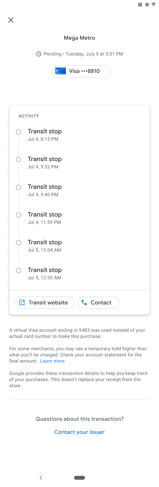 A single end-of-day settlement can leave users unsure how much they were actually charged and which journeys relate to that settlement. To address this, Google Wallet developed receipt roll-ups. Receipt roll-ups merge all taps related to a single settlement into one transaction that's shown to the user. This rollup happens throughout the day, without the price, and then it gets updated after the final price is known.
