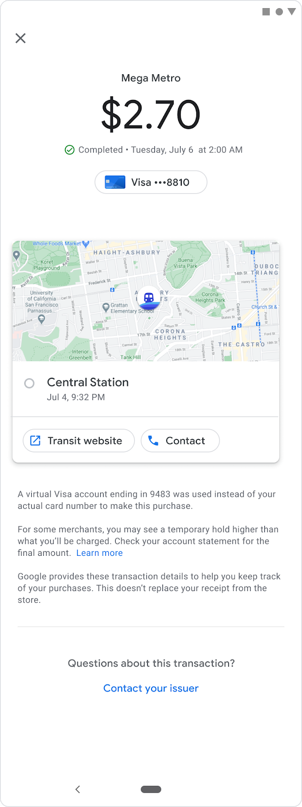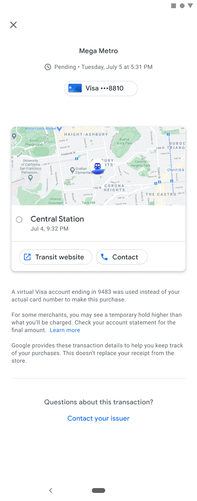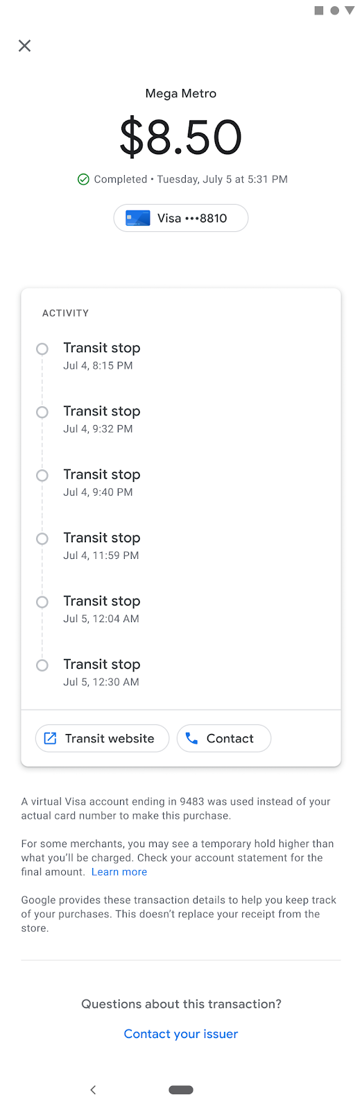 One of the key advantages a user gets when they use a mobile device to pay is the ability to see details of their transaction. Google Wallet provides an intuitive user interface that allows users to see their transaction history. Rich receipts contain the agency name and logo, as well as a map of the location where the user made the transaction. If the agency uses fare capping, the rich receipt might also display a summary of the final settlement.