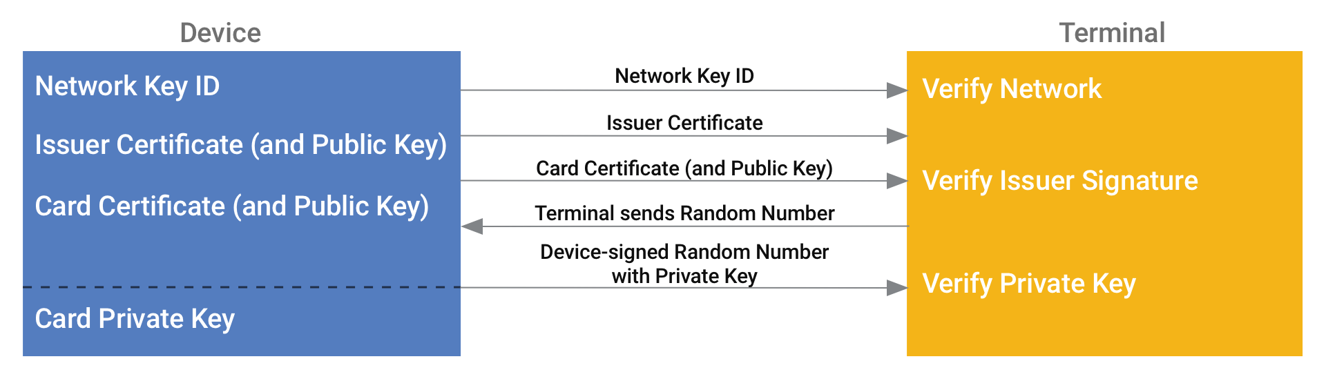 Google Wallet uses keys and certificates from the payment network and issuing bank. This allows authentication with the payment terminal in offline mode.