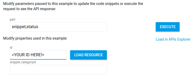 You can execute requests by clicking the Execute button next to the list of request parameters. If you have not previously authorized the application to submit API requests on your behalf, you will be prompted to do so. As an extra precaution, if your request performs a write operation – inserting, updating, or deleting resources associated with your channel – you will be asked to confirm that you want to execute the request before it actually executes.